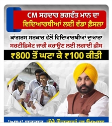 ਵਿਰੋਧੀ ਪਾਰਟੀਆਂ ਵੱਲੋਂ ਇਹ ਮੁੱਦਾ ਚੁੱਕਿਆ ਗਿਆ ਤਾਂ ਇਹ ਮਾਮਲਾ ਮੁੱਖ ਮੰਤਰੀ ਭਗਵੰਤ ਮਾਨ ਦੇ ਧਿਆਨ ‘ਚ ਆਇਆ। ਉਨ੍ਹਾਂ ਤੁਰੰਤ ਸਿੱਖਿਆ ਮੰਤਰੀ ਮੀਤ ਹੇਅਰ ਨਾਲ ਗੱਲਬਾਤ ਕਰ ਕੇ ਵਿਦਿਆਰਥੀਆਂ ਨੂੰ ਰਾਹਤ ਦਿੰਦਿਆਂ ਬੋਰਡ ਪ੍ਰਤੀ ਸਖਤ ਰੁਖ ਅਪਣਾਉਂਦਿਆਂ ਕਾਂਗਰਸ ਸਰਕਾਰ ਸਮੇਂ ਸ਼ੁਰੂ ਹੋਈ 800 ਰੁਪਏ ਦੀ ਥਾਂ ਸਿਰਫ਼ 100 ਰੁਪਏ ਫੀਸ ਜਮ੍ਹਾਂ ਕਰਵਾਉਣ ਦਾ ਐਲਾਨ ਕਰ ਦਿੱਤਾ ਜਿਸ ਨਾਲ ਸਮੁੱਚੇ ਵਿਦਿਆਰਥੀਆਂ ਨੂੰ ਵੱਡੀ ਰਾਹਤ ਮਿਲੀ ਹੈ। ਸੈਂਕੜੇ ਵਿਦਿਆਰਥੀ ਅਜਿਹੇ ਸਨ, ਜਿਨ੍ਹਾਂ ਦੇ ਮਾਤਾ-ਪਿਤਾ ਆਰਥਿਕ ਪੱਖੋਂ ਕਮਜ਼ੋਰ ਹੋਣ ਕਾਰਨ ਇਹ ਫੀਸ ਭਰਨ ਤੋਂ ਅਸਮਰੱਥ ਸਨ। ਇਸ ਨੂੰ ਧਿਆਨ ਵਿਚ ਰੱਖਦੇ ਹੋਏ ਪੰਜਾਬ ਦੀ ਨਵੀਂ ਸਰਕਾਰ ਯਾਨੀ ਆਮ ਆਦਮੀ ਪਾਰਟੀ ਦੀ ਸਰਕਾਰ ਨੇ ਇਹ ਸਖ਼ਤ ਕਦਮ ਚੁੱਕਿਆ ਹੈ।