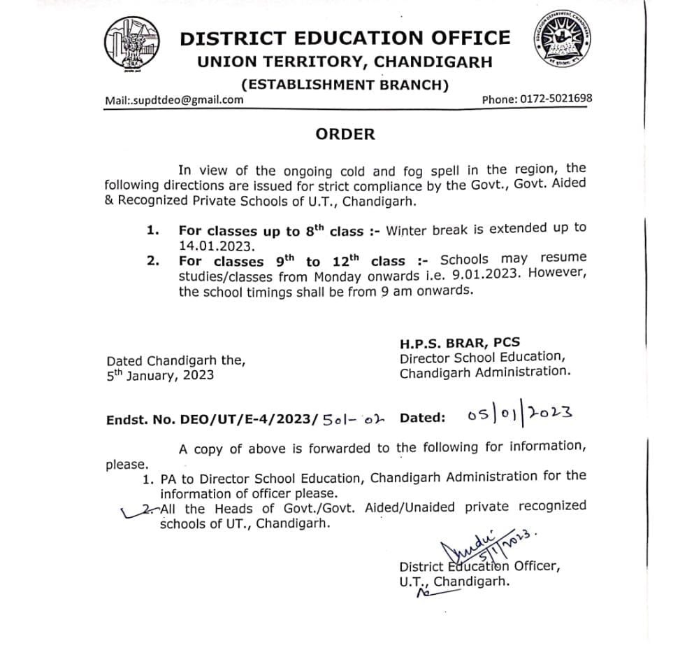 ਚੰਡੀਗੜ੍ਹ, – ਚੰਡੀਗੜ੍ਹ ਦੇ ਸਿੱਖਿਆ ਮਹਿਕਮੇ ਨੇ ਸਰਕਾਰੀ ਤੇ ਨਿੱਜੀ ਸਕੂਲਾਂ ਵਿਚ ਛੁੱਟੀਆਂ ਵਧਾ ਦਿੱਤੀਆਂ ਗਈਆਂ ਹਨ । ਲਗਾਤਾਰ ਚੱਲ ਰਹੀ ਠੰਢ ਅਤੇ ਧੁੰਦ ਦੇ ਮੱਦੇਨਜ਼ਰ ਕੇਂਦਰੀ ਸ਼ਾਸਤ ਪ੍ਰਦੇਸ਼, ਚੰਡੀਗੜ੍ਹ ਦੇ ਸਿੱਖਿਆ ਵਿਭਾਗ ਵਲੋਂ ਪਹਿਲੀ ਤੋਂ ਅੱਠਵੀਂ ਤੱਕ ਦੇ ਵਿਦਿਆਰਥੀਆਂ ਦੀਆਂ ਛੁੱਟੀਆਂ ’ਚ 14 ਜਨਵਰੀ ਤੱਕ ਦਾ ਵਾਧਾ ਕੀਤਾ ਹੈ ।