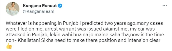ਨਵੀਂ ਦਿੱਲੀ, – ਹਮੇਸ਼ਾ ਸੁਰਖ਼ੀਆਂ ਵਿਚ ਰਹਿਣ ਵਾਲੀ ਬਾਲੀਵੁੱਡ ਅਦਾਕਾਰਾ ਕੰਗਣਾ ਰਣੌਤ ਨੇ ਪੰਜਾਬ ਦੇ ਅਜਨਾਲਾ ਵਿਚ ਵਾਪਰੀ ਘਟਨਾ ਉਤੇ ਟਵੀਟ ਕਰਦੇ ਹੋਏ ਕਿਹਾ ਕਿ, ‘ਉਸ ਨੇ ਪੰਜਾਬ ਸੰਬੰਧੀ ਦੋ ਸਾਲ ਪਹਿਲਾਂ ਹੀ ਭਵਿੱਖਬਾਣੀ ਕਰ ਦਿੱਤੀ ਸੀ।’ ਉਸ ਨੇ ਲਿਖਿਆ ਕਿ, ‘ਪੰਜਾਬ ਵਿਚ ਹੁਣ ਜੋ ਵੀ ਵਾਪਰ ਰਿਹਾ ਹੈ, ਉਸ ਨੇ ਦੋ ਸਾਲ ਪਹਿਲਾਂ ਹੀ ਇਸ ਦੀ ਭਵਿੱਖਬਾਣੀ ਕਰ ਦਿੱਤੀ ਸੀ।’ ਇਸ ਦੌਰਾਨ ਉਸ ਨੇ ਕਿਹਾ ਕਿ, ”ਉਸ ਖ਼ਿਲਾਫ਼ ਗ੍ਰਿਫ਼ਤਾਰੀ ਵਾਰੰਟ ਜਾਰੀ ਹੋਏ। ਪੰਜਾਬ ਵਿਚ ਉਸ ਦੀ ਕਾਰ ਉਪਰ ਭਿਆਨਕ ਹਮਲਾ ਹੋਇਆ ਪਰ ਉਹ ਹੀ ਹੋਇਆ ਜੋ ਮੈਂ ਕਿਹਾ ਸੀ।’ ਇਸ ਦੌਰਾਨ ਉਸ ਨੇ ਕਿਹਾ ਕਿ, ‘ਹੁਣ ਸਮਾਂ ਆ ਗਿਆ ਹੈ ਕਿ ਗ਼ੈਰ ਖ਼ਾਲਿਸਤਾਨੀ ਸਿੱਖ ਆਪਣਾ ਸਟੈਂਡ ਸਪੱਸ਼ਟ ਕਰਨ।’ ਦੱਸ ਦੇਈਏ ਕਿ ਕਿਸਾਨ ਅੰਦੋਲਨ ਸਮੇਂ ਵਿਚ ਕੰਗਣਾ ਰਣੌਤ ਦੇ ਬਿਆਨਾਂ ਕਾਰਨ ਪੰਜਾਬ ਵਿਚ ਉਸ ਉਪਰ ਮਾਮਲਾ ਦਰਜ ਕਰਵਾਇਆ ਗਿਆ ਸੀ। ਕਿਸਾਨ ਅੰਦੋਲਨ ਦੌਰਾਨ ਕੰਗਣਾ ਦੇ ਬਿਆਨਾਂ ਦੀ ਕਾਫ਼ੀ ਨਿਖੇਧੀ ਹੋਈ ਸੀ।