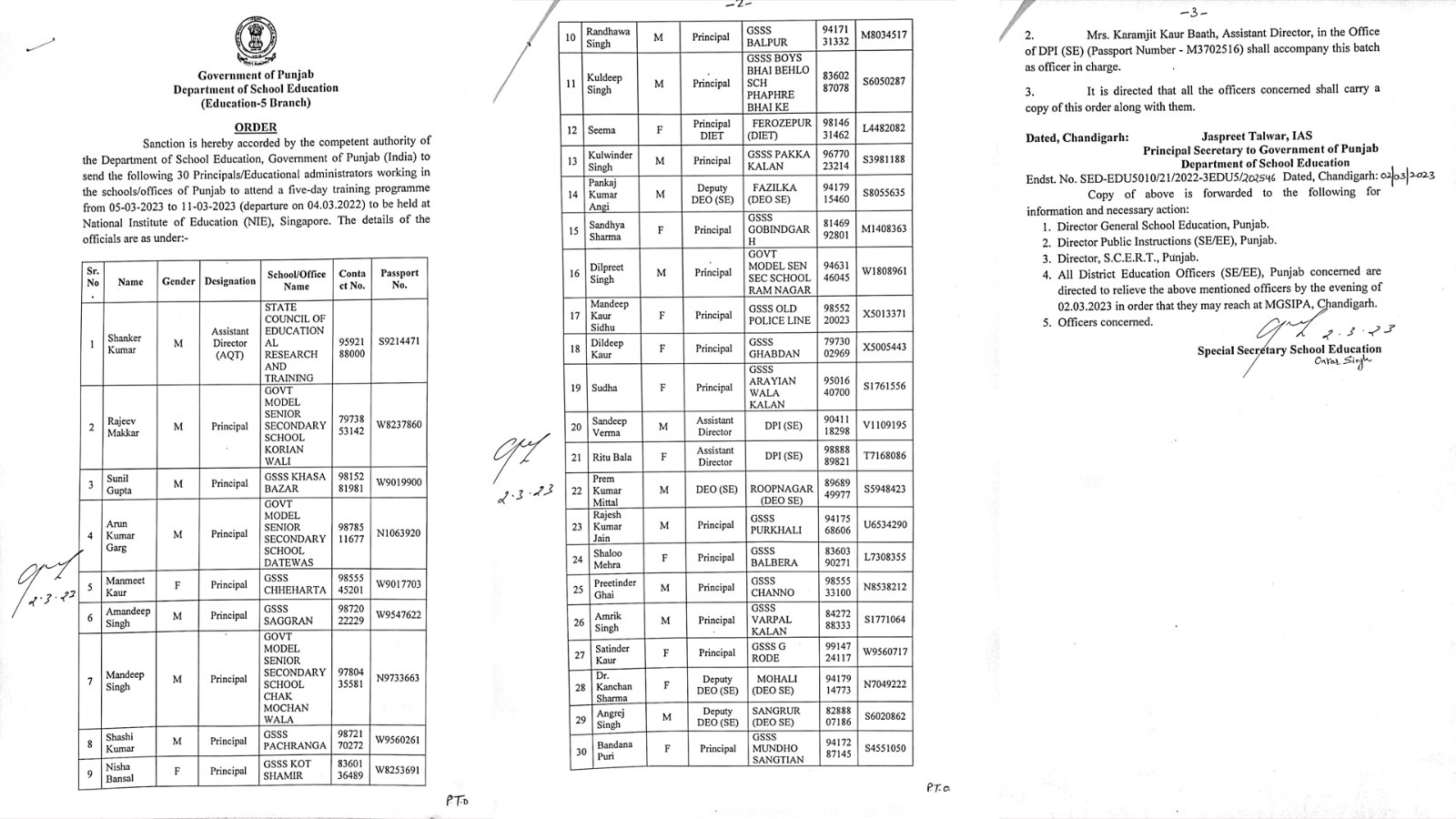 ਚੰਡੀਗੜ੍ਹ, – 5 ਮਾਰਚ ਨੂੰ ਪ੍ਰਿੰਸੀਪਲਾਂ ਦਾ ਦੂਜਾ ਬੈਚ ਸਿੰਗਾਪੁਰ ਵਿਖੇ ਨੈਸ਼ਨਲ ਇੰਸਟੀਚਿਊਟ ਆਫ਼ ਐਜੂਕੇਸ਼ਨ ਵਿਚ ਵਿਦੇਸ਼ੀ ਸਿਖਲਾਈ ਲਈ ਰਵਾਨਾ ਹੋਵੇਗਾ। ਇਸ ਵਿਚ ਪੰਜਾਬ ਦੇ 30 ਪ੍ਰਿੰਸੀਪਲ ਸਿੰਗਾਪੁਰ ਜਾਣਗੇ। ਇਹ ਟਰੇਨਿੰਗ 5 ਤੋਂ 11 ਮਾਰਚ ਤੱਕ ਹੋਵੇਗੀ। Share Our Daily Posts