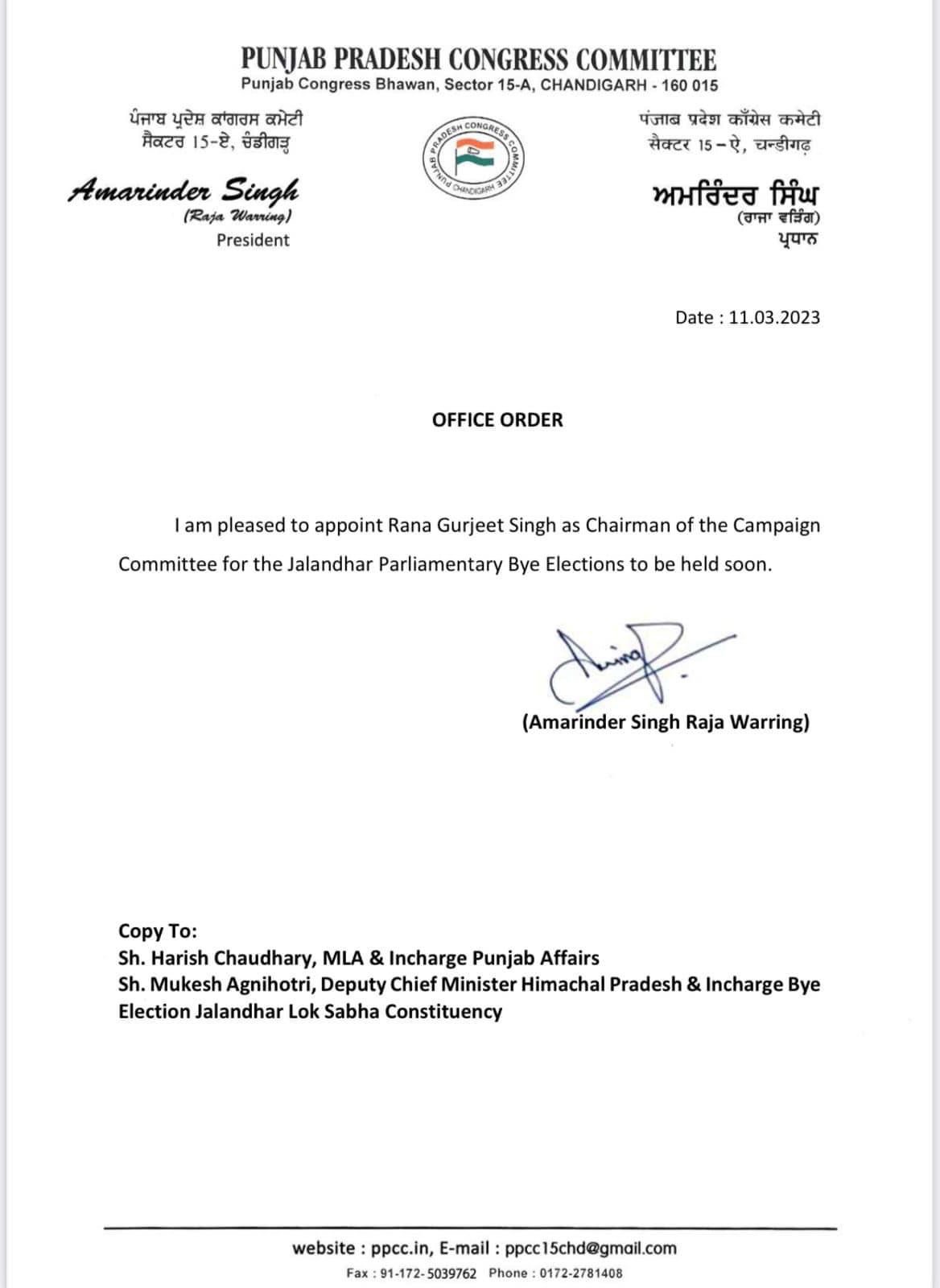 ਜਲੰਧਰ ਸੰਸਦੀ ਜ਼ਿਮਨੀ ਚੋਣ ਲਈ ਰਾਣਾ ਗੁਰਜੀਤ ਸਿੰਘ ਨੂੰ ਕੰਪੇਨ ਕਮੇਟੀ ਦਾ ਚੇਅਰਮੈਨ ਨਿਯੁਕਤ ਕਰਕੇ ਖੁਸ਼ੀ ਹੋ ਰਹੀ ਹੈ – ਰਾਜਾ ਵੜਿੰਗ Share Our Daily Posts