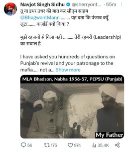 ਸਿੱਧੂ ਨੇ ਕਿਹਾ “ਮੈਂ ਤੁਹਾਨੂੰ ਪੰਜਾਬ ਦੀ ਪੁਨਰ ਸੁਰਜੀਤੀ ਅਤੇ ਮਾਫੀਆ ਨੂੰ ਤੁਹਾਡੀ ਸਰਪ੍ਰਸਤੀ ਬਾਰੇ ਸੈਂਕੜੇ ਸਵਾਲ ਪੁੱਛੇ ਹਨ….. ਇੱਕ ਵੀ ਜਵਾਬ ਨਹੀਂ? ………ਹੁਣ ਤੁਸੀਂ ਆਪਣੀਆਂ ਨੈਤਿਕ ਕਦਰਾਂ-ਕੀਮਤਾਂ ਦੇ ਨਾਲ ਆਪਣੇ ਸਭ ਤੋਂ ਹੇਠਲੇ ਪੱਧਰ ‘ਤੇ ਝੁਕ ਗਏ ਹੋ।