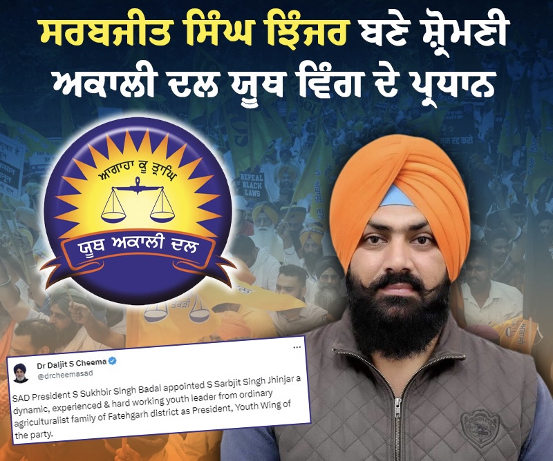 ਚੰਡੀਗੜ੍ਹ, – ਸ਼੍ਰੋਮਣੀ ਅਕਾਲੀ ਦਲ ਦੇ ਪ੍ਰਧਾਨ ਸੁਖਬੀਰ ਸਿੰਘ ਬਾਦਲ ਨੇ ਜ਼ਿਲ੍ਹਾ ਫਤਹਿਗੜ੍ਹ ਸਾਹਿਬ ਦੇ ਸਾਧਾਰਨ ਕਿਸਾਨ ਪਰਿਵਾਰ ਦੇ ਗਤੀਸ਼ੀਲ, ਤਜ਼ਰਬੇਕਾਰ ਅਤੇ ਮਿਹਨਤੀ ਨੌਜਵਾਨ ਆਗੂ ਸ. ਸਰਬਜੀਤ ਸਿੰਘ ਝਿੰਜਰ ਨੂੰ ਪਾਰਟੀ ਦਾ ਯੂਥ ਵਿੰਗ ਦਾ ਪ੍ਰਧਾਨ ਨਿਯੁਕਤ ਕੀਤਾ ਹੈ। ਇਹ ਜਾਣਕਾਰੀ ਡਾ. ਦਲਜੀਤ ਸਿੰਘ ਚੀਮਾ ਵਲੋਂ ਇਕ ਟਵੀਟ ਰਾਹੀਂ ਦਿੱਤੀ ਗਈ।