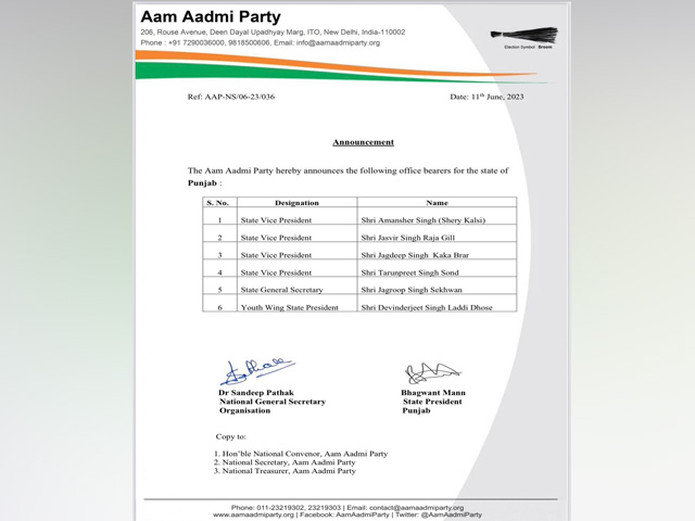 ਚੰਡੀਗੜ੍ਹ, – ਆਮ ਆਦਮੀ ਪਾਰਟੀ ਵਲੋਂ ਪਾਰਟੀ ਵਿਚ ਫ਼ੇਰਬਦਲ ਕਰਦਿਆਂ 7 ਨਵੇਂ ਅਹੁਦੇਦਾਰ ਨਿਯੁਕਤ ਕੀਤੇ ਗਏ ਹਨ। ਪ੍ਰਿੰਸੀਪਲ ਬੁੱਧ ਰਾਮ ਨੂੰ ‘ਆਪ’ ਪੰਜਾਬ ਦਾ ਕਾਰਜਕਾਰੀ ਪ੍ਰਧਾਨ ਬਣਾਇਆ ਗਿਆ ਹੈ। ‘ਆਪ’ ਨੇ ਫ਼ੇਰਬਦਲ ਤਹਿਤ ਅਮਨਸ਼ੇਰ ਸਿੰਘ ਸ਼ੈਰੀ ਕਲਸੀ ਨੂੰ ਸੂਬਾ ਮੀਤ ਪ੍ਰਧਾਨ ਬਣਾਇਆ ਹੈ। ਇਸ ਤੋਂ ਇਲਾਵਾ ਹੋਰ ਵੀ ਕਈ ਆਗੂਆਂ ਨੂੰ ਨਵੀਆਂ ਜ਼ਿੰਮੇਵਾਰੀਆਂ ਸੌਂਪੀਆਂ ਗਈਆਂ ਹਨ।