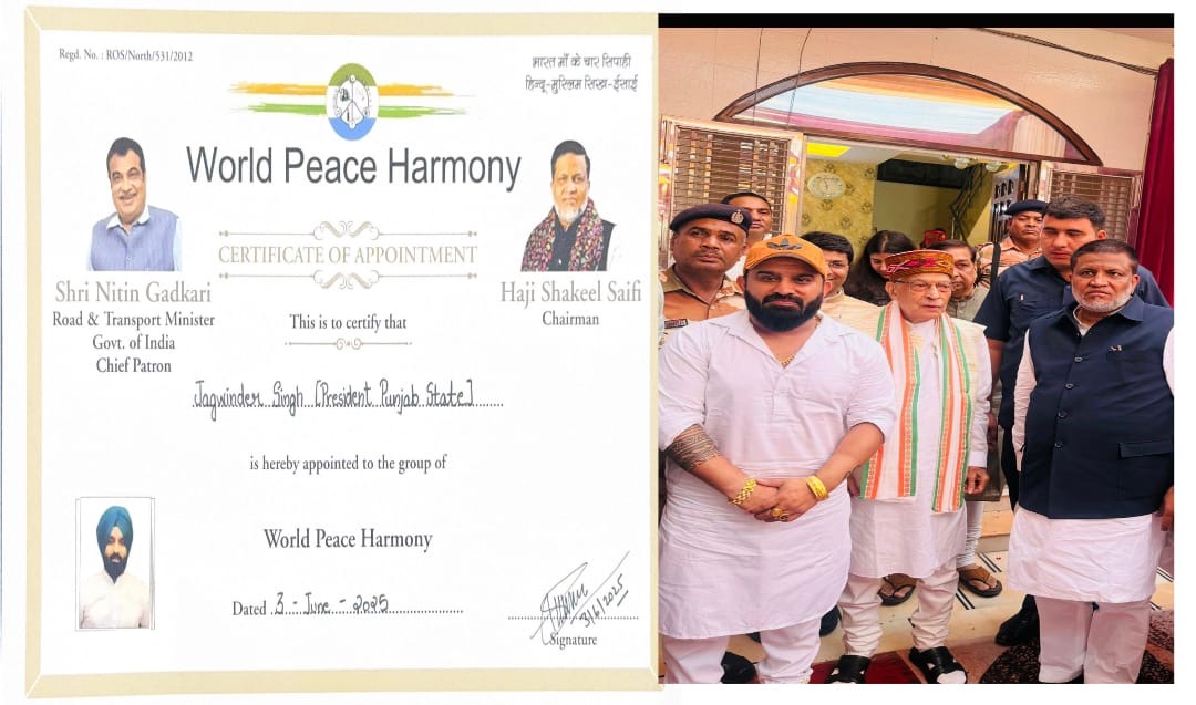 ਜਲੰਧਰ : ਕੰਵਲਜੀਤ ਸਿੰਘ ਮੱਕੜ (ਇੰਡੀਆ ਜਾਗ੍ਰਿਤੀ) – ਵਿਸ਼ਵ ਅਮਨ ਅਤੇ ਭਾਈਚਾਰੇ ਲਈ ਕੰਮ ਕਰ ਰਹੀ ਅੰਤਰਰਾਸ਼ਟਰੀ ਗੈਰ-ਸੰਸਥਾ ਵਰਲਡ ਪੀਸ ਹਾਰਮਨੀ (World Peace Harmony) ਵੱਲੋਂ ਇਕ ਖ਼ਾਸ ਸਮਾਗਮ ਦੌਰਾਨ ਸੰਸਥਾ ਦੀ ਟੀਮ ਦੀ ਘੋਸ਼ਣਾ ਕੀਤੀ ਗਈ। ਇਸ ਮੌਕੇ ‘ਤੇ ਭਾਰਤ ਸਰਕਾਰ ਦੇ ਰੋਡ ਐਂਡ ਟਰਾਂਸਪੋਰਟ ਮੰਤਰੀ ਸ਼੍ਰੀ ਨਿਤਿਨ ਗਡਕਰੀ ਨੂੰ ਸੰਸਥਾ ਦਾ ਚੀਫ ਪੈਟਰਨ (Chief Patron) ਨਿਯੁਕਤ ਕੀਤਾ ਗਿਆ।