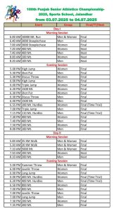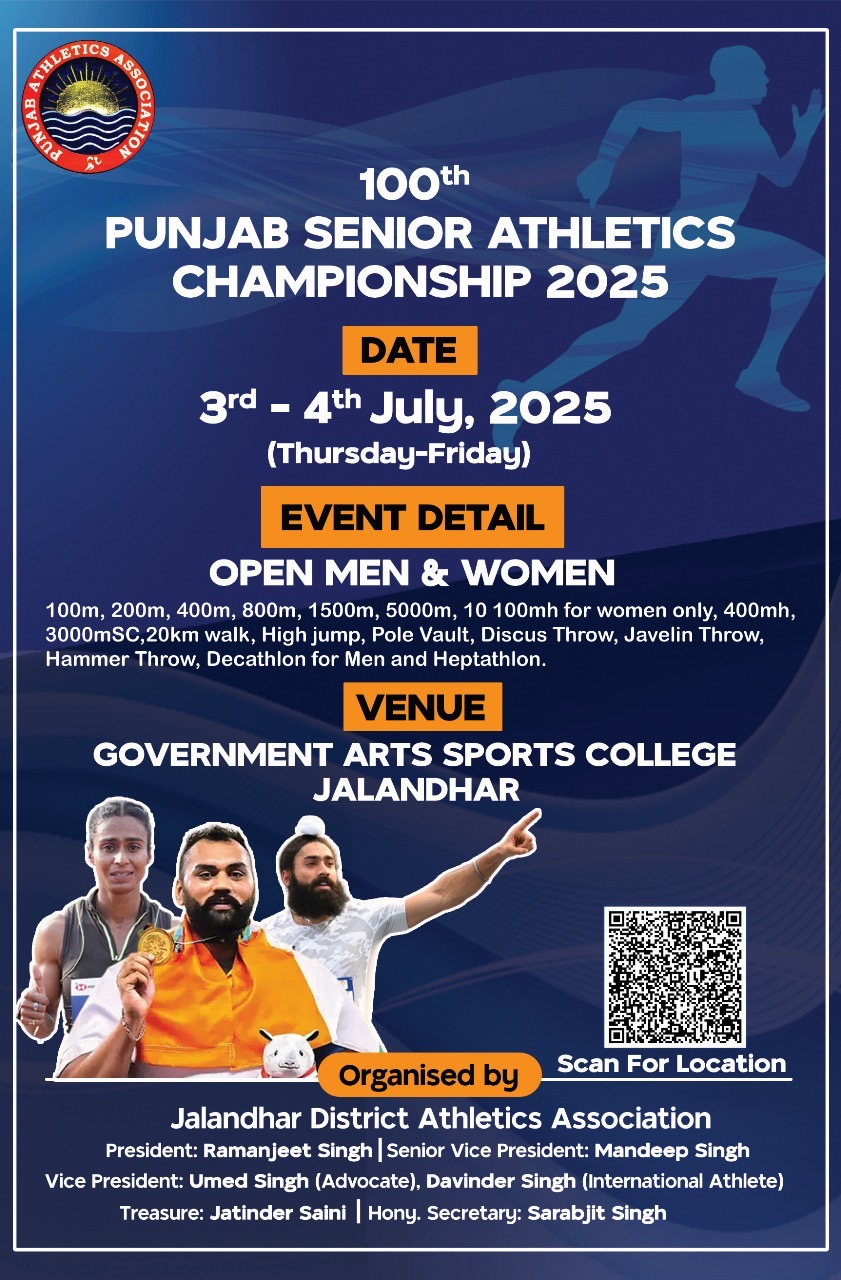 ਜਲੰਧਰ : ਕੰਵਲਜੀਤ ਸਿੰਘ ਮੱਕੜ ਤੇ ਜੇ ਐਸ ਸੰਧੂ – ਜਲੰਧਰ ਡਿਸਟ੍ਰਿਕਟ ਐਥਲੈਟਿਕ ਐਸੋਸੀਏਸ਼ਨ ਵੱਲੋਂ 100ਵੀਂ ਪੰਜਾਬ ਸੀਨੀਅਰ ਐਥਲੈਟਿਕ ਚੈਂਪੀਅਨਸ਼ਿਪ 2025 ਦਾ ਆਯੋਜਨ 3 ਅਤੇ 4 ਜੁਲਾਈ ਨੂੰ ਗਵਰਨਮੈਂਟ ਆਰਟਸ ਸਪੋਰਟਸ ਕਾਲਜ, ਜਲੰਧਰ ਵਿਖੇ ਕੀਤਾ ਜਾ ਰਿਹਾ ਹੈ। ਇਹ ਇਤਿਹਾਸਕ ਮੋਕੇ ਵਾਲੀ ਚੈਂਪੀਅਨਸ਼ਿਪ ਪੰਜਾਬ ਦੇ ਐਥਲੈਟਿਕ ਇਤਿਹਾਸ ਦਾ ਸੌਵਾਂ ਸੋਨੇ ਪੰਨਾ ਲਿਖੇਗੀ।