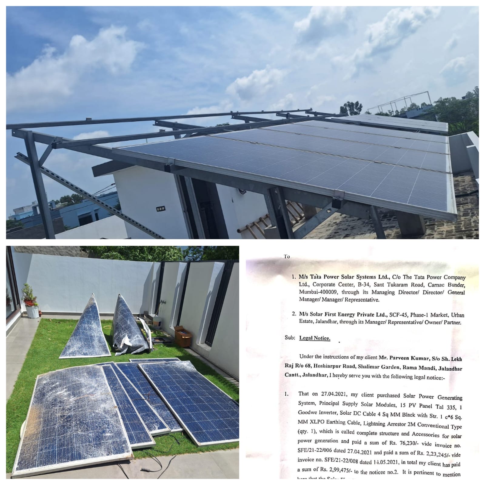 ਨੋਟਿਸ ਵਿੱਚ ਦੱਸਿਆ ਗਿਆ ਹੈ ਕਿ ਸੋਲਰ ਫਰਸਟ ਐਨਰਜੀ ਪ੍ਰਾਈਵੇਟ ਲਿਮਟਿਡ, ਜੋ ਕਿ ਟਾਟਾ ਪਾਵਰ ਸੋਲਰ ਦੀ ਅਧਿਕਾਰਤ ਸਾਂਝੀਦਾਰ ਅਤੇ ਡੀਲਰ ਹੈ, ਨੇ ਉਪਕਰਣ ਦੀ ਸਪਲਾਈ ਅਤੇ ਸੇਵਾ ਵਿੱਚ ਘੋਟਾਲਾ ਕੀਤਾ। ਇਹ ਦੋਵੇਂ ਕੰਪਨੀਆਂ ਨਵੀਂ ਅਤੇ ਨਵੀਕਰਨ ਯੋਗ ਊਰਜਾ ਮੰਤਰਾਲਾ ਅਤੇ PEDA ਵੱਲੋਂ ਮਨਜ਼ੂਰਸ਼ੁਦਾ ਹਨ, ਪਰ ਇਨ੍ਹਾਂ ਵਿਰੁੱਧ ਗਾਹਕ ਨੇ ਸਹੀ ਸਮਾਂ ਤੇ ਉਪਕਰਣ ਨਾ ਮਿਲਣ ਜਾਂ ਸਹੀ ਸੇਵਾ ਨਾ ਮਿਲਣ ਦਾ ਦੋਸ਼ ਲਾਇਆ ਹੈ।