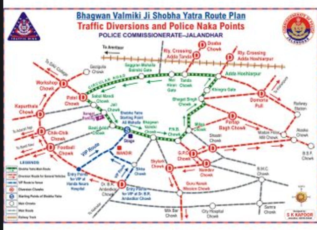 ਜਲੰਧਰ (ਕੰਵਲਜੀਤ ਸਿੰਘ ਮੱਕੜ) – ਭਗਵਾਨ ਵਾਲਮੀਕੀ ਜੀ ਦੇ ਪ੍ਰਕਾਸ਼ ਪੁਰਬ ਨੂੰ ਸਮਰਪਿਤ ਸ਼ੋਭਾ ਯਾਤਰਾਵਾਂ ਲਈ ਜਾਲੰਧਰ ਪ੍ਰਸ਼ਾਸਨ ਅਤੇ ਟ੍ਰੈਫ਼ਿਕ ਪੁਲਿਸ ਵੱਲੋਂ ਪੱਕੇ ਬੰਦੋਬਸਤ ਕੀਤੇ ਗਏ ਹਨ। 6 ਅਕਤੂਬਰ ਨੂੰ ਦੁਪਹਿਰ 2 ਵਜੇ ਅਲੀ ਮੋਹੱਲੇ ਦੇ ਪ੍ਰਾਚੀਨ ਮੰਦਰ ਤੋਂ ਸ਼ੋਭਾ ਯਾਤਰਾ ਸ਼ੁਰੂ ਹੋਏਗੀ ਜੋ ਸ਼ਹਿਰ ਦੇ ਵੱਖ–ਵੱਖ ਰਸਤੇ ਰਾਹੀਂ ਨਿਕਲਦੀ ਹੋਈ ਮੁੜ ਅਲੀ ਮੋਹੱਲੇ ‘ਚ ਸਮਾਪਤ ਹੋਏਗੀ।