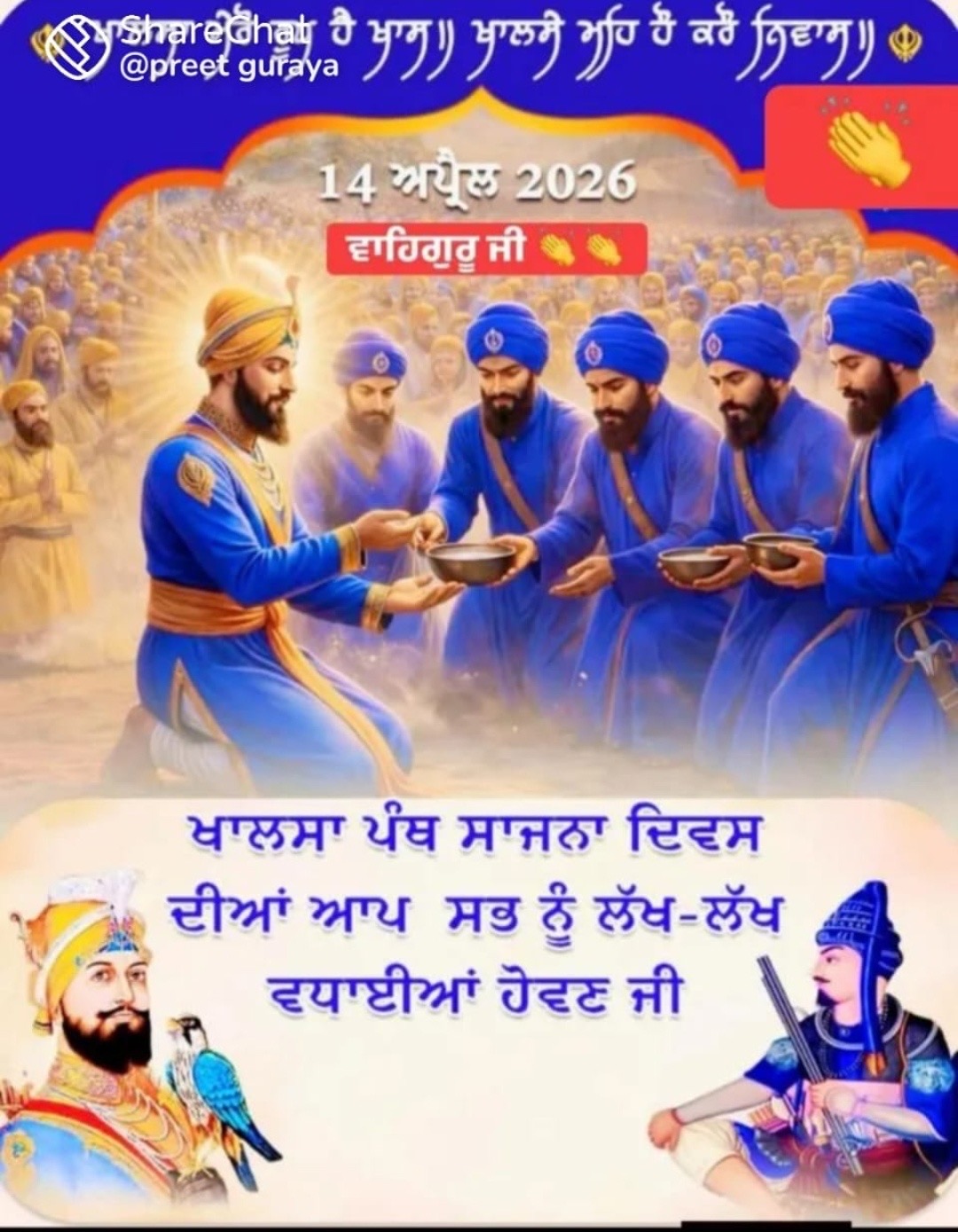 ਵਿਸਾਖੀ ਦਾ ਦਿਨ ਸਿੱਖ ਇਤਿਹਾਸ ਵਿੱਚ 1699 ਨਾਲ ਅਮਰ ਹੋ ਗਿਆ, ਜਦੋਂ ਸ੍ਰੀ ਅਨੰਦਪੁਰ ਸਾਹਿਬ ਵਿਖੇ ਦਸਵੇਂ ਪਾਤਸ਼ਾਹ ਸ੍ਰੀ ਗੁਰੂ ਗੋਬਿੰਦ ਸਿੰਘ ਜੀ ਨੇ ਖਾਲਸਾ ਪੰਥ ਦੀ ਸਥਾਪਨਾ ਕੀਤੀ। ਇਸ ਮੌਕੇ ਗੁਰੂ ਜੀ ਨੇ ਹਜ਼ਾਰਾਂ ਦੀ ਸੰਗਤ ਵਿਚੋਂ ਪੰਜ ਸਹਿਬਾਨ ਨੂੰ ਚੁਣਿਆ, ਜੋ “ਪੰਜ ਪਿਆਰੇ” ਵਜੋਂ ਜਾਣੇ ਜਾਂਦੇ ਹਨ – ਭਾਈ ਦਇਆ ਸਿੰਘ ਜੀ, ਭਾਈ ਧਰਮ ਸਿੰਘ ਜੀ, ਭਾਈ ਹਿੰਮਤ ਸਿੰਘ ਜੀ, ਭਾਈ ਮੋਹਕਮ ਸਿੰਘ ਜੀ ਅਤੇ ਭਾਈ ਸਾਹਿਬ ਸਿੰਘ ਜੀ।