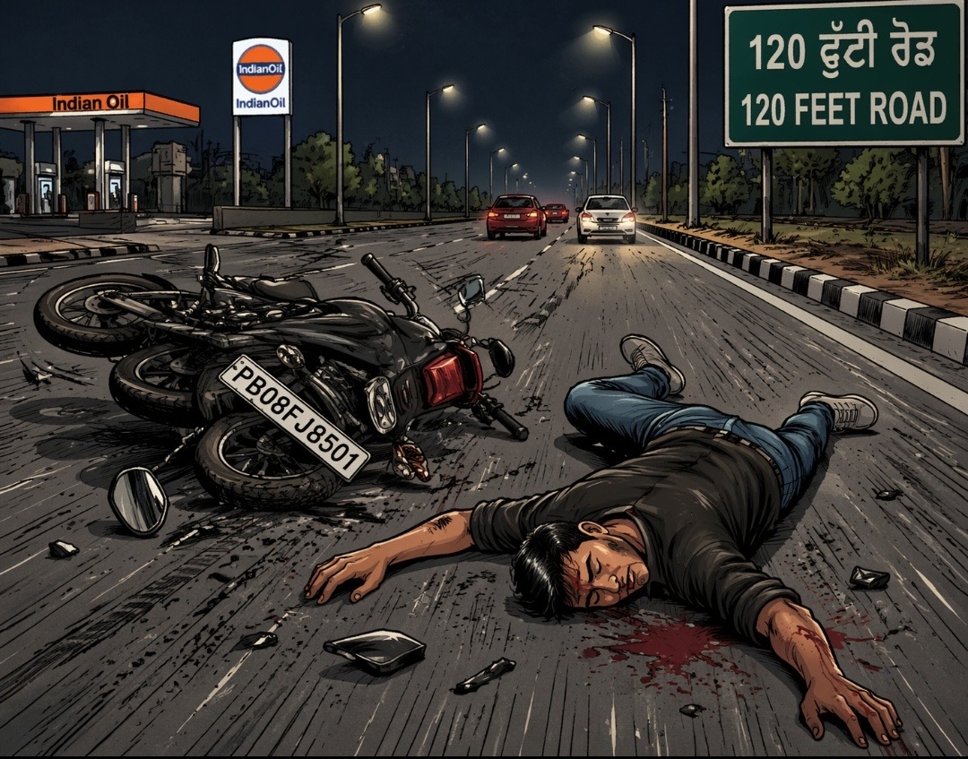 ਜਲੰਧਰ : ਕੰਵਲਜੀਤ ਸਿੰਘ ਮੱਕੜ – ਜਲੰਧਰ: ਮਹਾਨਗਰ ਦੇ 120 ਫੁੱਟੀ ਰੋਡ ‘ਤੇ ਇੰਡੀਆਨ ਆਇਲ ਪੈਟਰੋਲ ਪੰਪ ਨੇੜੇ ਦੇਰ ਰਾਤ ਇਕ ਭਿਆਨਕ ਸੜਕ ਹਾਦਸੇ ਵਿੱਚ ਇਕ ਬਾਈਕ ਸਵਾਰ ਨੌਜਵਾਨ ਗੰਭੀਰ ਰੂਪ ਵਿੱਚ ਜਖ਼ਮੀ ਹੋ ਗਿਆ। ਚਸ਼ਮਦੀਦਾਂ ਮੁਤਾਬਕ ਟੱਕਰ ਇੰਨੀ ਜ਼ਬਰਦਸਤ ਸੀ ਕਿ ਬਾਈਕ ਘਸੀਟਦੀ ਹੋਈ ਕਰੀਬ ਅੱਧਾ ਕਿਲੋਮੀਟਰ ਦੂਰ ਜਾ ਡਿੱਗੀ।
