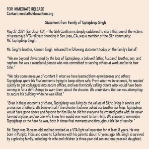 ਸੈਨ ਜੋਸ ਕੈਲੇਫੋਰਨੀਆ ਵਿਚ ਬੀਤੇ ਦਿਨੀ ਹੋਈ ਗੋਲ਼ੀਬਾਰੀ ਵਿਚ ਮਾਰੇ ਗਏ ਇਕ ਪੰਜਾਬੀ ਤਪਤੇਜਦੀਪ ਸਿੰਘ ਜੋ ਸਿੱਖ ਭਾਈਚਾਰੇ ਨਾਲ ਸਬੰਧ ਰੱਖਦਾ ਹੈ, ਇਸ ਗੋਲ਼ੀਬਾਰੀ ਵਿਚ ਮਾਰਿਆ ਗਿਆ। ਤਰਨਤਾਰਨ ਦੇ ਪਿੰਡ ਗਗੜੇਵਾਲ ਦਾ ਰਹਿਣ ਵਾਲਾ ਤਪਤੇਜਦੀਪ ਸਿੰਘ ਗਿੱਲ ਦੇ ਪਰਿਵਾਰ ਨੇ ਇਸ ਬਿਆਨ ਜਾਰੀ ਕੀਤਾ ਹੈ ਜਿਸ ਵਿਚ ਉਸ ਦੇ ਭਰਾ ਕਰਮਨ ਸਿੰਘ ਨੇ ਕਿਹਾ ਕਿ ਤਪਤੇਜਦੀਪ ਸਿੰਘ ਜਿਥੇ ਇਕ ਬਹੁਤ ਵਧੀਆ ਇਨਸਾਨ ਸੀ ਉਥੇ ਉਹ ਇਕ ਚੰਗਾ ਪਿਤਾ, ਪਿਆਰ ਕਰਨ ਵਾਲਾ ਪਤੀ, ਦੇਖਭਾਲ ਕਰਨ ਵਾਲਾ ਭਰਾ ਤੇ ਪੱੁਤਰ ਹੋਣ ਦੇ ਨਾਲ ਨਾਲ ਭਤੀਜਾ ਵੀ ਸੀ। ਉਹ ਇਕ ਵਿਲੱਖਣ ਇਨਸਾਨ ਸੀ ਜਿਸ ਦੇ ਦਿਲ ਵਿਚ ਸਮਾਜ ਪ੍ਰਤੀ ਸੇਵਾ ਕਰਨ ਦਾ ਜਜ਼ਬਾ ਸੀ। ਉਹ ਆਪਣੇ ਖਾਲੀ ਸਮੇਂ ਵਿਚ ਹਮੇਸ਼ਾਂ ਹੀ ਸਮਾਜ ਸੇਵਾ ਦੇ ਕਾਰਜ ਕਰਦਾ ਰਹਿੰਦਾ ਸੀ।