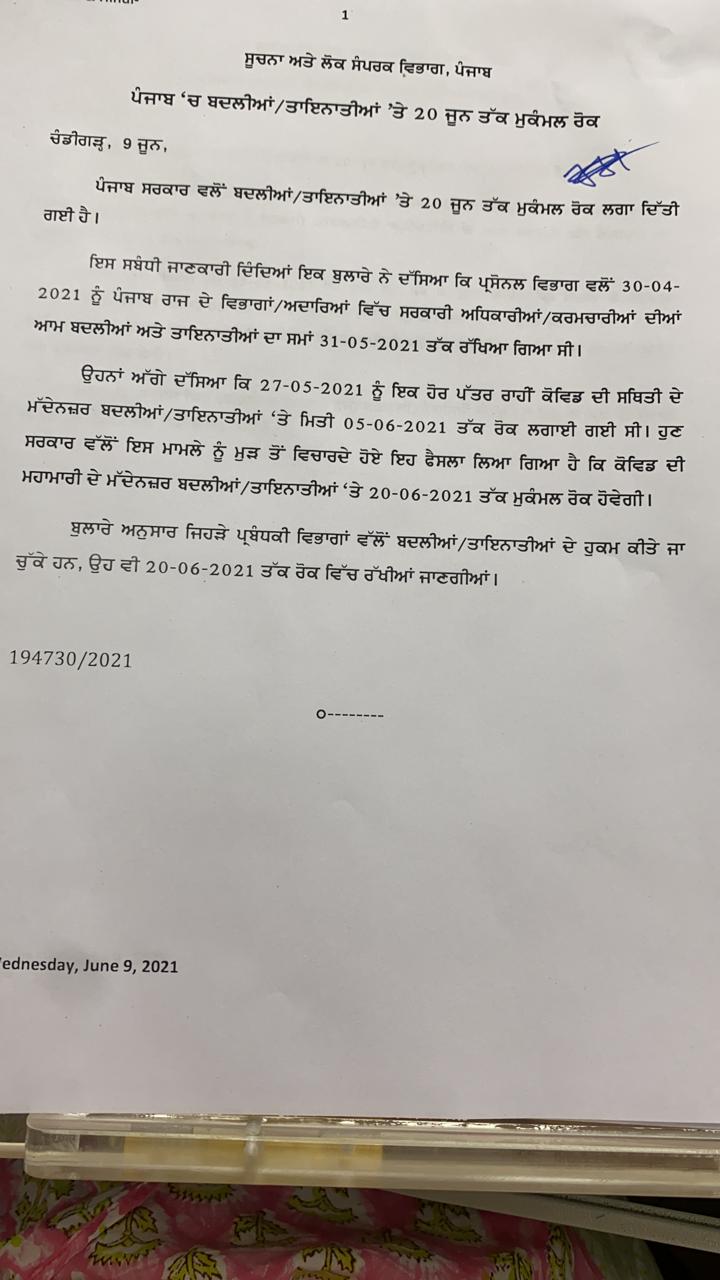 ਚੰਡੀਗੜ੍ਹ , 9 ਜੂਨ -ਪੰਜਾਬ ਸਰਕਾਰ ਵਲੋਂ ਪੰਜਾਬ ‘ਚ ਬਦਲੀਆਂ /ਤਾਇਨਾਤੀਆਂ ‘ਤੇ 20 ਜੂਨ ਤੱਕ ਮੁਕੰਮਲ ਰੋਕ ਲੱਗਾ ਦਿੱਤੀ ਗਈ ਹੈ । ਬੁਲਾਰੇ ਅਨੁਸਾਰ ਜਿਹੜੇ ਪ੍ਰਬੰਧਕੀ ਵਿਭਾਗਾਂ ਵਲੋਂ ਬਦਲੀਆਂ /ਤਾਇਨਾਤੀਆਂ ਦੇ ਹੁਕਮ ਕੀਤੇ ਜਾ ਚੁੱਕੇ ਹਨ , ਉਹ ਵੀ 20 ਜੂਨ ਤੱਕ ਰੋਕ ਵਿਚ ਰੱਖੀਆਂ ਜਾਣਗੀਆਂ । Share Our Daily Posts