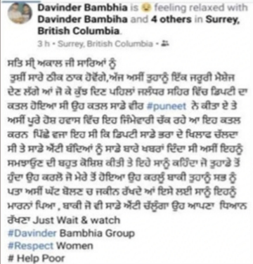 ਜਲੰਧਰ, 29 ਜੂਨ – : ਸਾਬਕਾ ਕੌਂਸਲਰ ਸੁਖਮੀਤ ਡਿਪਟੀ ਦੀ ਹੱਤਿਆ ਦੀ ਜ਼ਿਮੇਵਾਰੀ ਬੰਬੀਹਾ ਗਰੁੱਪ ਦੇ ਵਲੋਂ ਲਈ ਗਈ ਹੈ | ਖ਼ਬਰ ਸ਼ੇਅਰ ਕਰੋ Share Our Daily Posts