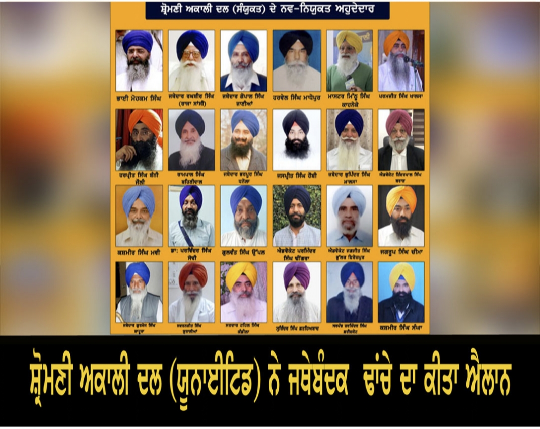 ਚੰਡੀਗੜ੍ਹ ,5 ਜੁਲਾਈ: ਸ਼੍ਰੋਮਣੀ ਅਕਾਲੀ ਦਲ (ਯੂਨਾਈਟਿਡ) ਦੇ ਸਰਪ੍ਰਸਤ ਜਥੇਦਾਰ ਰਣਜੀਤ ਸਿੰਘ ਬ੍ਰਹਮਪੁਰਾ ਅਤੇ ਪਾਰਟੀ ਪ੍ਰਧਾਨ ਸਰਦਾਰ ਸੁਖਦੇਵ ਸਿੰਘ ਢੀਂਡਸਾ (ਰਾਜ ਸਭਾ ਮੈਂਬਰ) ਨੇ ਪਾਰਟੀ ਦੇ ਜਨਰਲ ਸਕੱਤਰ ਨਾਲ ਪਾਰਟੀ ਦੇ ਸੰਗਠਨਾਤਮਕ ਢਾਂਚੇ ਦਾ ਐਲਾਨ ਕਰਨ ਲਈ ਵਿਚਾਰ ਵਟਾਂਦਰੇ ਕੀਤੇ। ਅੱਜ ਪਾਰਟੀ ਹੈੱਡਕੁਆਰਟਰ ਤੋਂ ਪਾਰਟੀ ਦੀ ਸੂਚੀ ਜਾਰੀ ਕਰਦਿਆਂ ਸੁਖਦੇਵ ਸਿੰਘ ਢੀਂਡਸਾ ਦੇ ਰਾਜਨੀਤਿਕ ਸਲਾਹਕਾਰ ਦਵਿੰਦਰ ਸਿੰਘ ਅਤੇ ਦਫਤਰ ਸਕੱਤਰ ਮਨਿੰਦਰਪਾਲ ਸਿੰਘ ਬਰਾੜ ਨੇ ਕਿਹਾ ਕਿ ਰਣਜੀਤ ਸਿੰਘ ਬ੍ਰਹਮਪੁਰਾ ਆਪਸੀ ਸਲਾਹ ਮਸ਼ਵਰਾ ਅਗਲੇ ਦਿਨਾਂ ਵਿਚ ਕੀਤਾ ਜਾਵੇਗਾ। ਸੀਨੀਅਰ ਮੀਤ ਪ੍ਰਧਾਨ -ਭਾਈ ਮੋਹਕਮ ਸਿੰਘ, ਜਥੇਦਾਰ ਰਘਬੀਰ ਸਿੰਘ (ਰਾਜਾ ਸੈਂਸੀ), ਜਥੇਦਾਰ ਗੋਪਾਲ ਸਿੰਘ ਜਾਣੇ-ਪਛਾਣੇ ਮੈਂਬਰ ਸ਼੍ਰੋਮਣੀ ਗੁਰਦੁਆਰਾ ਪ੍ਰਬੰਧਕ ਕਮੇਟੀ, ਸ੍ਰੀ ਹਰਵੇਲ ਸਿੰਘ ਮਾਧੋਪੁਰ ਅਤੇ ਹੋਰ ਅਹੁਦੇਦਾਰ ਚੁਣੇ ਗਏ ਹਨ।
