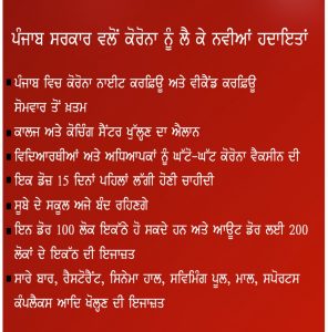 ਚੰਡੀਗੜ੍ਹ,9 ਜੁਲਾਈ ਪੰਜਾਬ ਵਿਚ ਕੋਰੋਨਾ ਨਾਈਟ ਕਰਫ਼ਿਊ ਅਤੇ ਵੀਕੈਂਡ ਕਰਫ਼ਿਊ ਸੋਮਵਾਰ ਤੋਂ ਖ਼ਤਮ ਹੋ ਗਏ ਹਨ। ਇਸ ਦੇ ਨਾਲ ਹੀ ਸੂਬਾ ਸਰਕਾਰ ਨੇ ਕਾਲਜ ਅਤੇ ਕੋਚਿੰਗ ਸੈਂਟਰ ਖੁੱਲ੍ਹਣ ਦਾ ਐਲਾਨ ਕਰ ਦਿੱਤਾ ਹੈ। ਜਿਸ ਤਹਿਤ ਵਿਦਿਆਰਥੀਆਂ ਅਤੇ ਅਧਿਆਪਕਾਂ ਨੂੰ ਘੱਟੋ-ਘੱਟ ਕੋਰੋਨਾ ਵੈਕਸੀਨ ਦੀ ਇਕ ਡੋਜ਼ 15 ਦਿਨਾਂ ਪਹਿਲਾਂ ਲੱਗੀ ਹੋਣੀ ਚਾਹੀਦੀ ਹੈ। ਇਸ ਦੇ ਨਾਲ ਹੀ ਸੂਬੇ ਦੇ ਸਕੂਲ ਅਜੇ ਬੰਦ ਰਹਿਣਗੇ। ਇਨ ਡੋਰ 100 ਲੋਕ ਇਕੱਠੇ ਹੋ ਸਕਦੇ ਹਨ ਅਤੇ ਆਊਟ ਡੋਰ ਲਈ 200 ਲੋਕਾਂ ਦੇ ਇਕੱਠ ਦੀ ਇਜਾਜ਼ਤ ਦਿੱਤੀ ਗਈ ਹੈ। ਨਾਲ ਹੀ ਕੋਵਿਡ ਨਿਯਮਾਂ ਨੂੰ ਤੋੜਨ ਵਾਲਿਆਂ ਖ਼ਿਲਾਫ਼ ਕਾਰਵਾਈ ਕਰਨ ਦੇ ਆਦੇਸ਼ ਦਿੱਤੇ ਗਏ ਹਨ। ਮੁੱਖ ਮੰਤਰੀ ਕੈਪਟਨ ਅਮਰਿੰਦਰ ਸਿੰਘ ਨੇ ਕੋਵਿਡ ਦੀ ਸਮੀਖਿਆ ਕਰਦਿਆਂ ਇਹ ਫ਼ੈਸਲਾ ਲਿਆ। ਇਸ ਦੇ ਨਾਲ ਹੀ ਰਾਜ ਵਿਚ ਸਾਰੇ ਬਾਰ, ਰੈਸਟੋਰੈਂਟ, ਸਿਨੇਮਾ ਹਾਲ, ਸਵਿਮਿੰਗ ਪੂਲ, ਮਾਲ, ਸਪੋਰਟਸ ਕੰਪਲੈਕਸ ਆਦਿ ਖੋਲ੍ਹਣ ਦੀ ਇਜਾਜ਼ਤ ਦਿੱਤੀ ਗਈ ਹੈ।