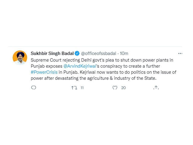 ਜਲੰਧਰ, 10 ਜੁਲਾਈ – ਸ਼੍ਰੋਮਣੀ ਅਕਾਲੀ ਦਲ (ਬ) ਦੇ ਪ੍ਰਧਾਨ ਸ. ਸੁਖਬੀਰ ਸਿੰਘ ਬਾਦਲ ਨੇ ਟਵੀਟ ਕਰਕੇ ਦਿੱਲੀ ਦੇ ਮੁੱਖ ਮੰਤਰੀ ਅਰਵਿੰਦ ਕੇਜਰੀਵਾਲ ‘ਤੇ ਨਿਸ਼ਾਨਾ ਸਾਧਿਆ ਹੈ। ਜਿਸ ਵਿਚ ਉਨ੍ਹਾਂ ਨੇ ਲਿਖਿਆ ਹੈ ਕਿ ਸੁਪਰੀਮ ਕੋਰਟ ਨੇ ਦਿੱਲੀ ਸਰਕਾਰ ਦੀ ਅਰਜ਼ੀ ਰੱਦ ਕਰ ਦਿੱਤੀ ਹੈ, ਜੋ ਅਰਜ਼ੀ ਪਾਵਰ ਪਲਾਂਟ ਨੂੰ ਬੰਦ ਕਰਨ ਲਈ ਪਾਈ ਗਈ ਸੀ। ਉਨ੍ਹਾਂ ਨੇ ਕਿਹਾ ਕਿ ਪੰਜਾਬ ਨੇ ਅਰਵਿੰਦ ਕੇਜਰੀਵਾਲ ਦੀ ਸਾਜ਼ਿਸ਼ ਦਾ ਪਰਦਾਫਾਸ਼ ਕਰ ਦਿੱਤਾ ਹੈ, ਜਿਸ ਵਿਚ ਉਹ ਪੰਜਾਬ ਦੇ ਬਿਜਲੀ ਸੰਕਟ ਨੂੰ ਹੋਰ ਗੰਭੀਰ ਕਰਨਾ ਚਾਹੁੰਦੇ ਸਨ। ਸੁਖਬੀਰ ਬਾਦਲ ਨੇ ਕਿਹਾ ਕਿ ਕੇਜਰੀਵਾਲ ਬਿਜਲੀ ਦੇ ਮੁੱਦੇ ‘ਤੇ ਸਿਆਸਤ ਕਰਕੇ ਪੰਜਾਬ ਦੀ ਖੇਤੀਬਾੜੀ ਤੇ ਉਦਯੋਗ ਨੂੰ ਬਰਬਾਦ ਕਰਨਾ ਚਾਹੁੰਦੇ ਹਨ।