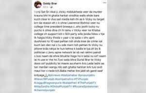 ਇਨ੍ਹੀਂ ਦਿਨੀਂ ਇਲਾਵਾ ਕੈਨੇਡਾ ਵਿਚ ਬੈਠੇ ਗੈਂਗਸਟਰ ਗੋਲਡੀ ਬਰਾਡ਼ ਦੀ ਫੇਸਬੁੱਕ ਪੋਸਟ ਵੀ ਸਾਹਮਣੇ ਆਈ ਹੈ। ਗੋਲਡੀ ਬਰਾਡ਼ ਕੈਨੇਡਾ ਵਿਚ ਬੈਠ ਕੇ ਲਾਰੈਂਸ ਬਿਸ਼ਨੋਈ ਅਤੇ ਕਾਲਾ ਜਠੇਡ਼ੀ ਗੈਂਗ ਨੂੰ ਆਪਰੇਟ ਕਰਦਾ ਹੈ। ਗੋਲਡੀ ਨੇ ਫੇਸਬੁੱਕ ਪੋਸਟ ਜ਼ਰੀਏ ਅਮਰੇਨੀਆ ਵਿਚ ਬੈਠੇ ਲੱਕੀ ਅਤੇ ਉਸ ਦੇ ਗੈਂਗ ਦੇ ਮੈਂਬਰ ਨੂੰ ਅੰਜਾਮ ਭੁਗਤਣ ਦੀ ਧਮਕੀ ਦਿੱਤੀ ਹੈ। ਉਸ ਨੇ ਲਿਖੀ ਹੈ, ‘ਲਡ਼ਾਈ ਲਡ਼ਨੀ ਹੈ ਤਾਂ ਮਰਦਾਂ ਵਾਂਗ ਲਡ਼ੋ। ਇਹ ਘਟੀਆ ਹਰਕਤਾਂ ਨਾ ਕਰੋ। ਬਾਬਾ ਮੇਹਰ ਕਰੋ। ਜਲਦ ਹੀ ਗੰਦ ਸਾਫ਼ ਕਰਾਂਗੇ।’