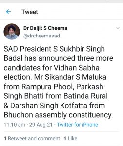 ਰਾਮਪੁਰਾ ਫੂਲ ਤੋਂ ਸਿਕੰਦਰ ਸਿੰਘ ਮਲੂਕਾ ਉਮੀਦਵਾਰ ਹੋਣਗੇ।